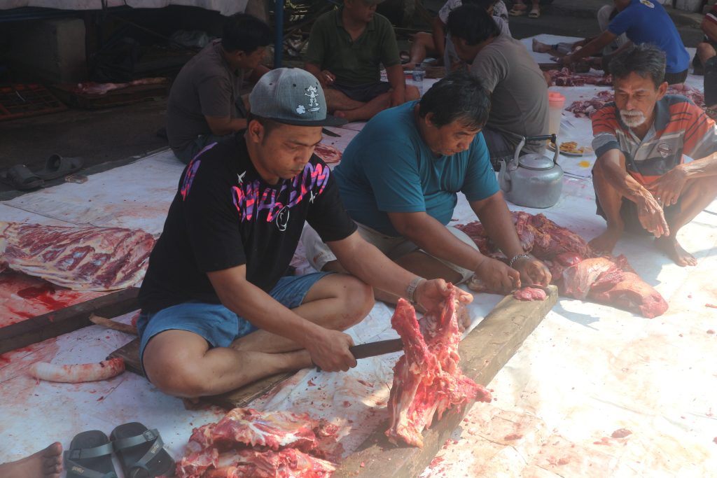 Penyembelihan hewan qurban dilakukan seusai pelaksanaan Sholat Ied sekitar pukul 08.30 WIB. Kegiatan berlangsung dengan penuh khidmat dan lancar, tanpa kendala berarti. Warga sekitar turut aktif membantu proses, mulai dari mencincang daging, memotong tulang, hingga menyayat kulit hewan qurban.